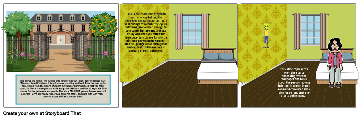 This slide represents when she starts obsessing over the wallpaper and talks about the person moving in it. She is locked in this room and convinced shes sick for so long that she starts going mental.