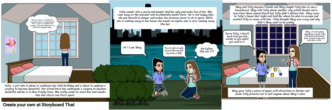 Tally- a girl who is about to celebrate her 16th birthday and is about to undergo a surgery to become beautiful. Her friend Peris has undergone a surgery to become beautiful and he is in New Pretty Town. She really wants to meet him and sneaks into the city to see Peris again.