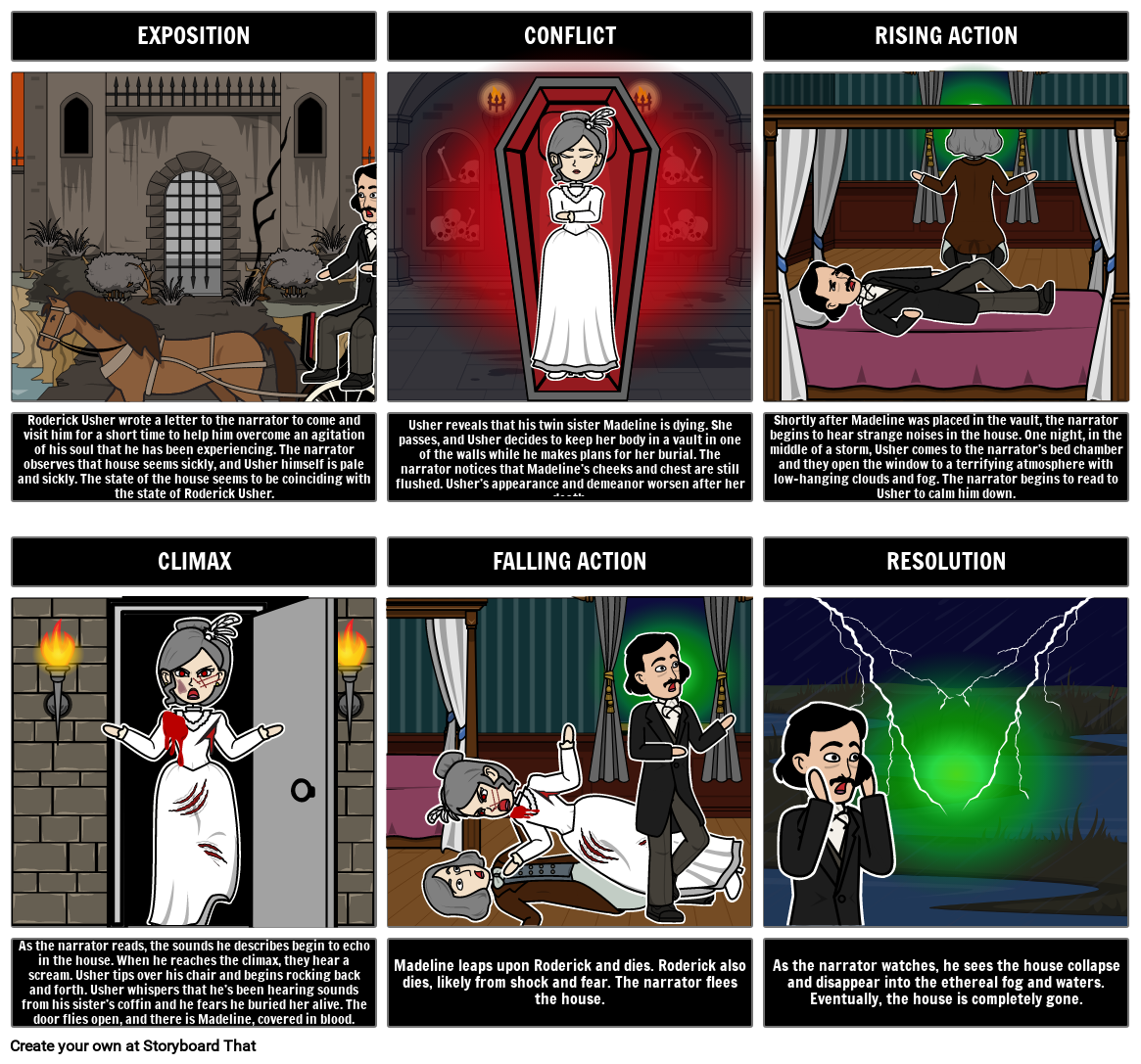 As the narrator reads, the sounds he describes begin to echo in the house. When he reaches the climax, they hear a scream. Usher tips over his chair and begins rocking back and forth. Usher whispers that he’s been hearing sounds from his sister’s coffin and he fears he buried her alive. The door flies open, and there is Madeline, covered in blood.