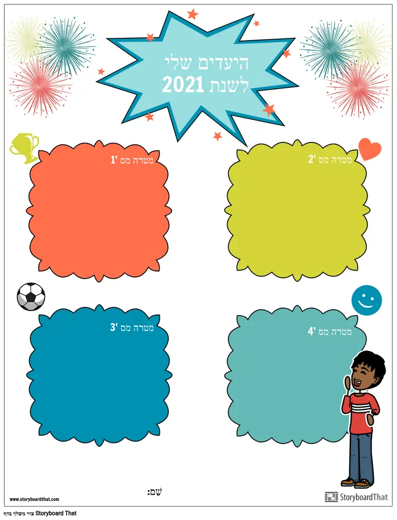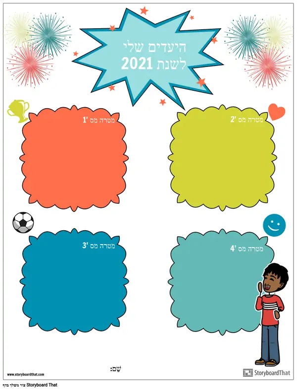 התלמידים יקלידו את 4 המטרות המובילות שלהם לשנת 2021 בתיבות. לאחר מכן, הם יכולים לבחור תווים, פריטים וסמלים המייצגים את עצמם ואת מטרותיהם ולהחליף את הקיימים בתבנית.