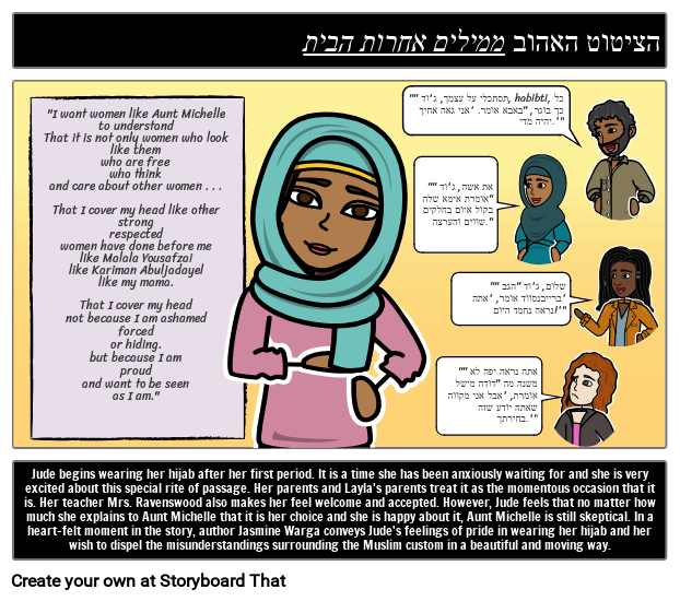 Jude begins wearing her hijab after her first period. It is a time she has been anxiously waiting for and she is very excited about this special rite of passage. Her parents and Layla's parents treat it as the momentous occasion that it is. Her teacher Mrs. Ravenswood also makes her feel welcome and accepted. However, Jude feels that no matter how much she explains to Aunt Michelle that it is her choice and she is happy about it, Aunt Michelle is still skeptical. In a heart-felt moment in the story, author Jasmine Warga conveys Jude's feelings of pride in wearing her hijab and her wish to dispel the misunderstandings surrounding the Muslim custom in a beautiful and moving way.