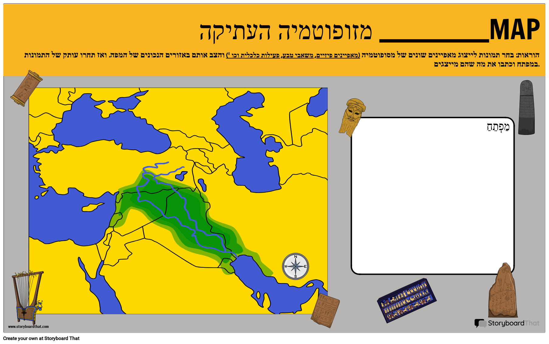 הוראות: בחר תמונות לייצוג מאפיינים שונים של מסופוטמיה (מאפיינים פיזיים, משאבי טבע, פעילות כלכלית וכו ') והצב אותם באזורים הנכונים של המפה. ואז תחרו עותק של התמונות במפתח וכתבו את מה שהם מייצגים.
