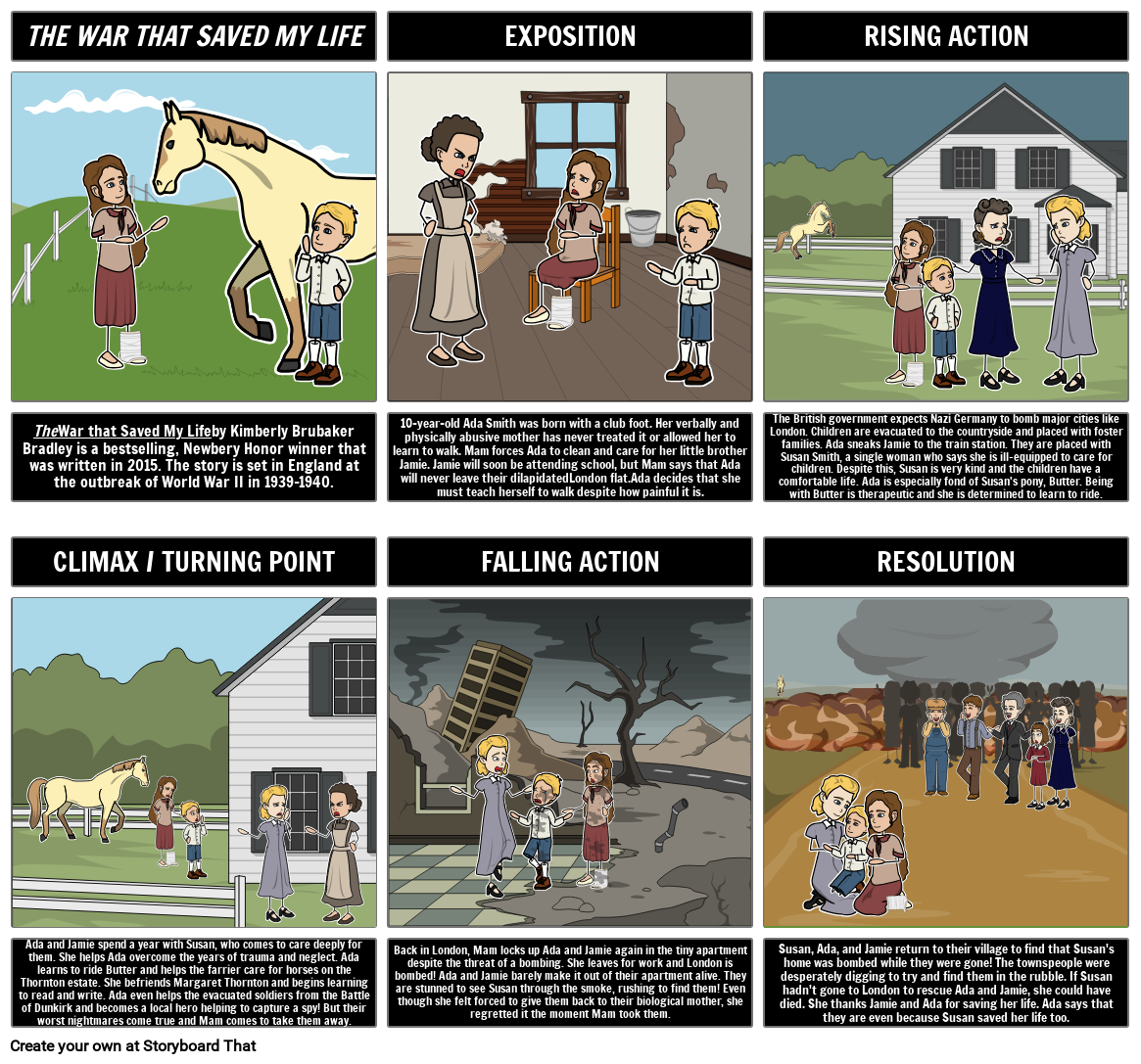 התלמידים יכולים לסכם ולהמחיש את עלילת הסיפור בלוח 6 תאים המדגיש את האקספוזיציה והקונפליקט, פעולה עולה, שיא / נקודת מפנה, פעולה נופלת ורזולוציה.