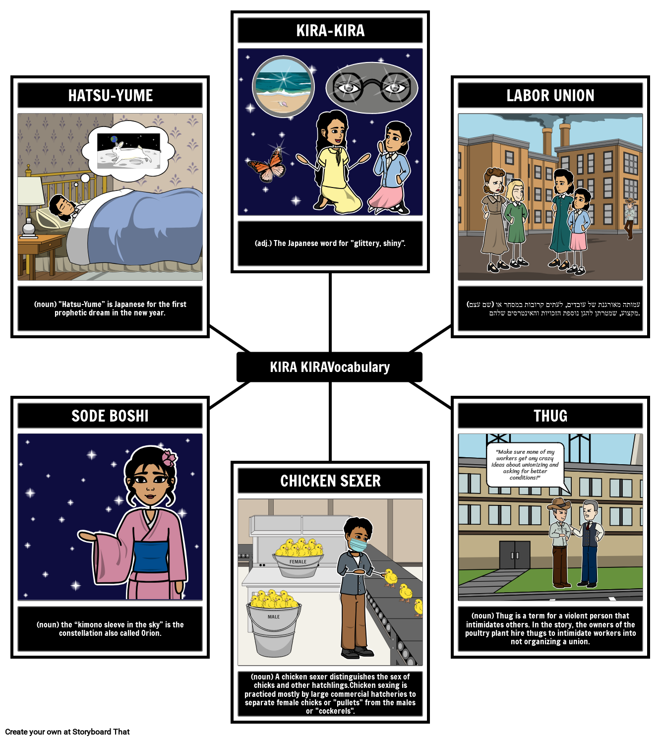 יש הרבה מונחי אוצר מילים ורמיזות ברומן Kira-Kira שיעזרו לתלמידים לצפות בתצוגה מקדימה. אלה יסייעו בהבנה הכוללת של הספר ובהבנה של פרקי הזמן. לוח סיפור זה כולל מונחי מפתח יחד עם הגדרות ואיורים.