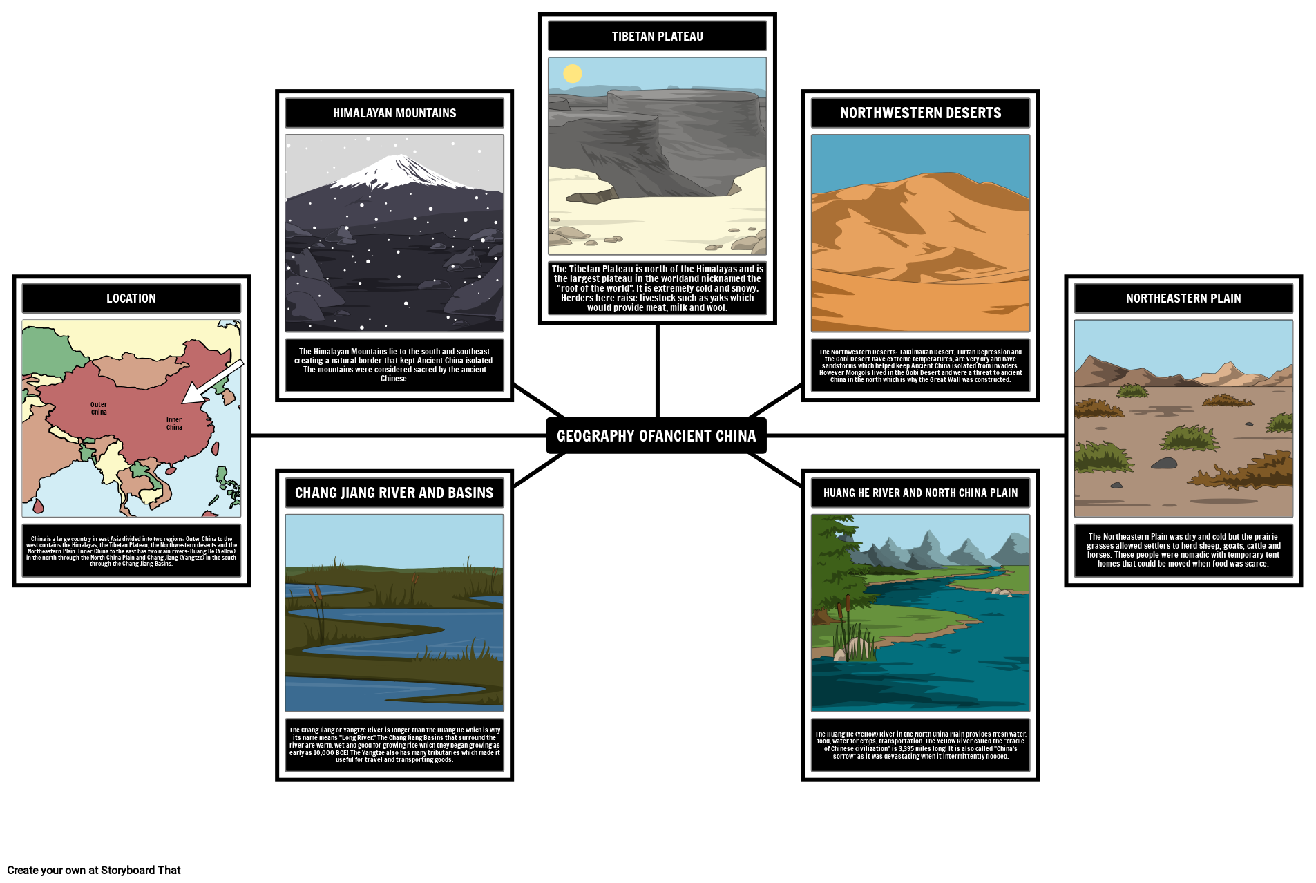 ענבים: גיאוגרפיה, דת, הישגים, פוליטיקה, כלכלה וחיים חברתיים. לוח סיפור זה מסביר את המאפיינים הגיאוגרפיים של סין העתיקה.