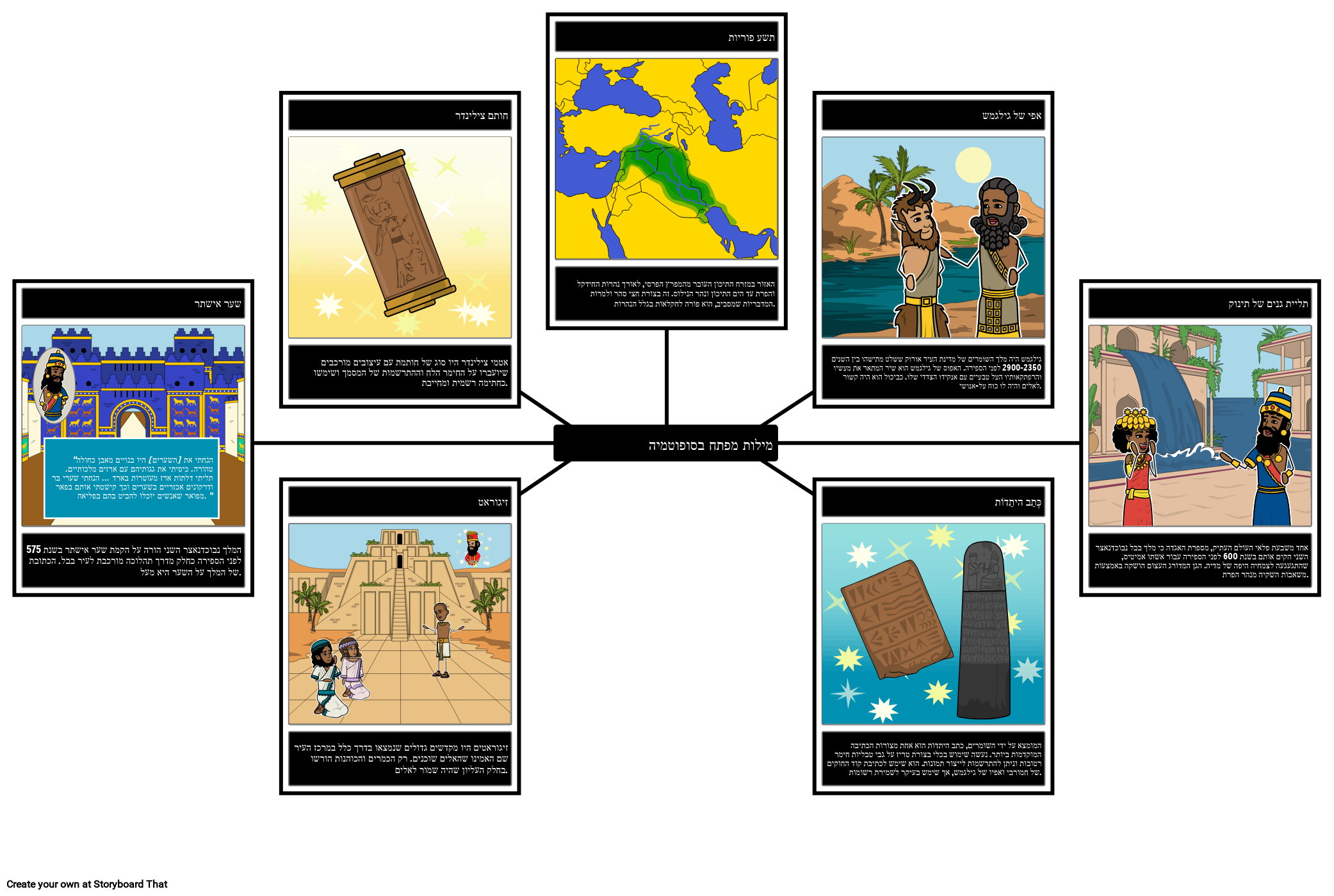 זיגוראטים היו מקדשים גדולים שנמצאו בדרך כלל במרכז העיר שם האמינו שהאלים שוכנים. רק הכמרים והכוהנות הורשו בחלק העליון שהיה שמור לאלים.