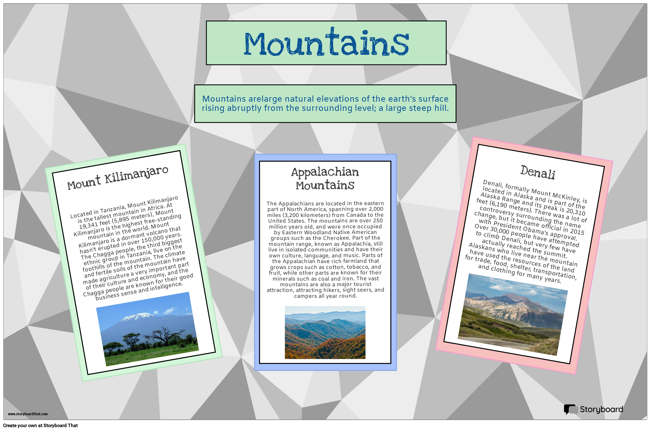 Denali, formally Mount McKinley, is located in Alaska and is part of the Alaska Range and its peak is 20,310 feet (6,190 meters). There was a lot of controversy surrounding the name change, but it became official in 2015 with President Obama's approval. Over 30,000 people have attempted to climb Denali, but very few have actually reached the summit. Alaskans who live near the mountain have used the resources of the land for trade, food, shelter, transportation, and clothing for many years.