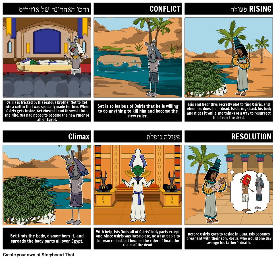 צור סיכום ויזואלי של מיתוס מצרי שיעזור להחיות את הסיפור! מיתוס זה הוא מותו של אוזיריס.