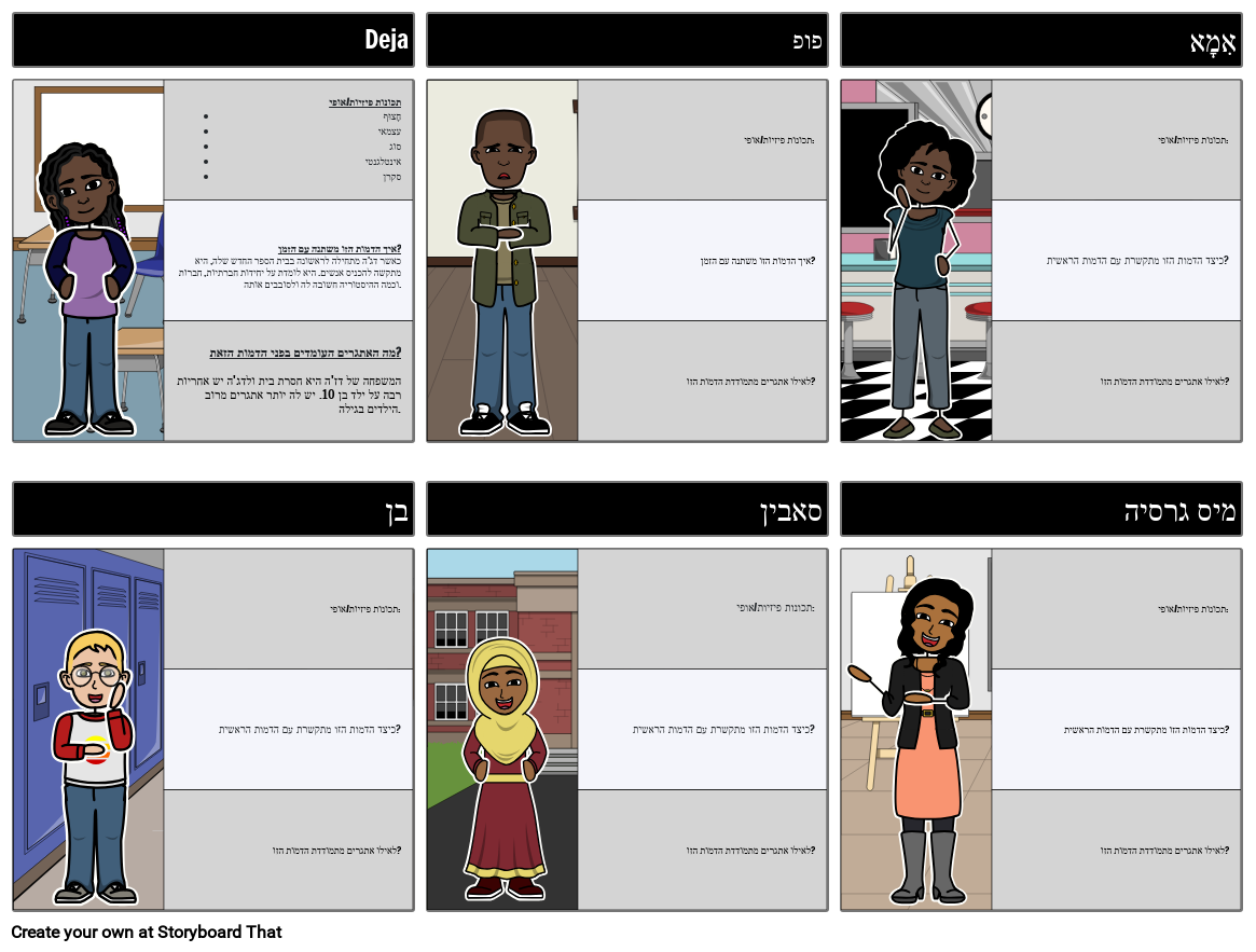 תכונות פיזיות/אופי: כיצד הדמות הזו מתקשרת עם הדמות הראשית? לאילו אתגרים מתמודדת הדמות הזו?