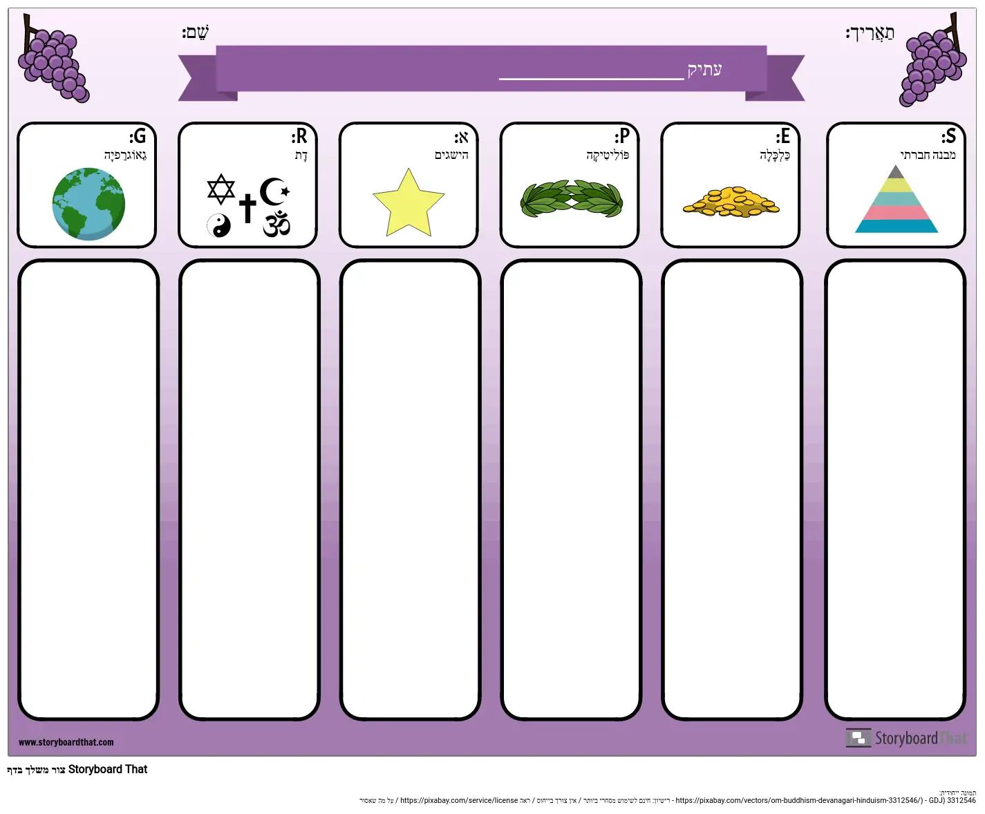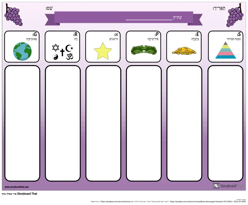 ראשי התיבות של GRAPES הם כלי מועיל בעת לימוד אודות תרבויות עתיקות או מדינות שונות. השתמש בתרשים GRAPES זה באופן דיגיטלי (בקש מהתלמידים להקליד את הערותיהם ולהוסיף תמונות לכל קטגוריה) או הדפיס אותו ותלמידים רשאים לכתוב בכתב ידם את הערותיהם.