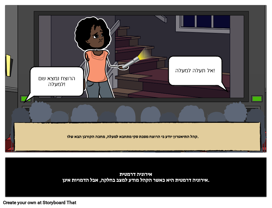 אירוניה דרמטיתאירוניה דרמטית היא כאשר הקהל מודע למצב בחלקה, אבל הדמויות אינן.