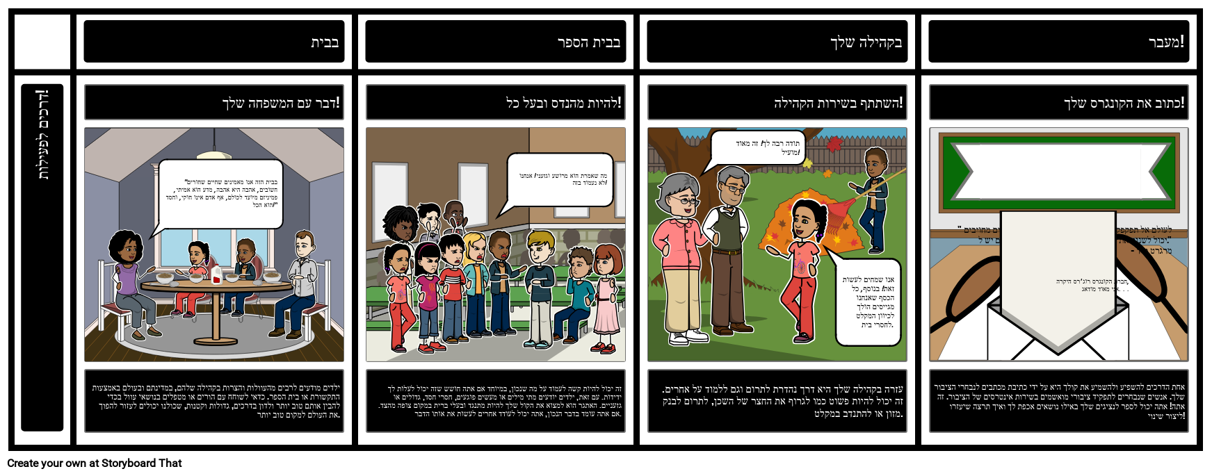 לוח סיפור זה מאפשר לילדים לסיעור מוחות בדרכים גדולות וקטנות בהן הם יכולים לעזור במאבק נגד עוול בכל צורותיו. ילדים מודעים מאוד לצרות העומדות בפני בית הספר, הקהילה והמדינה שלהם. הם שומעים על נושאים בתקשורת ומחברים ומשפחות. לפעמים לחשוב על הבעיות הרבות בהן בני אדם מתמודדים יכול להרגיש בלתי עביר. עם זאת, ניתן לעודד את התלמידים ש"כל מעשה חסד, קטן ככל שיהיה, מתבזבז אי פעם. " כולנו יחד במאמץ ליצור עולם מושלם יותר לדורות הבאים. מורים יכולים להקל על דיון על דרכים בהן התלמידים יכולים לדבר ולהתמודד עם סוגיות של עוול בבית, בבית הספר שלהם, בקהילה הרחבה ומחוצה לה. לאחר מכן, הם ייצרו לוח סיפור המשקף רעיונות אלה בעזרת איורים ותיאורים.