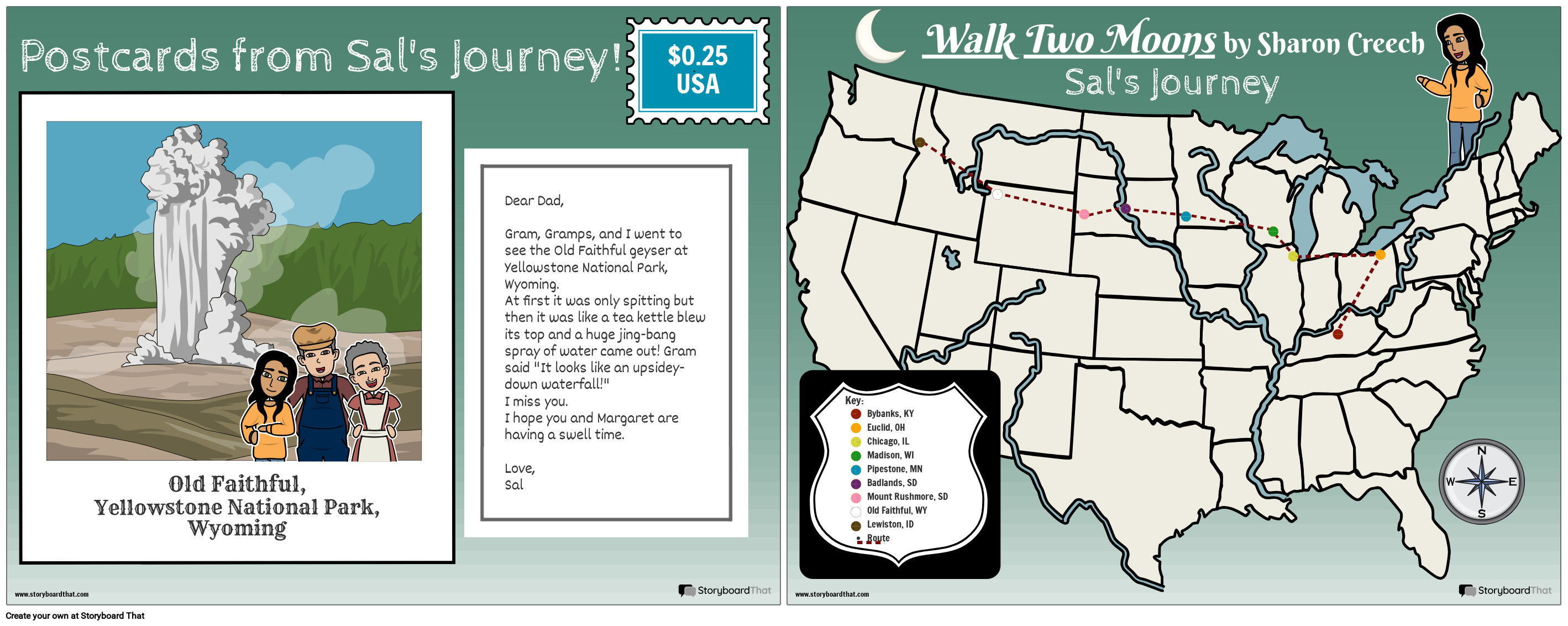 תפאורה של סיפור היא כל הזמן והמקום החשובים. בספר, Walk Two Moons, סל עוברת מביבנקס, קנטקי לאוקליד, אוהיו והם יוצאים למסע חוצה קאנטרי עם סבה וסבתה. בפעילות זו התלמידים יכולים להשתמש במפה כדי לזהות ולהמחיש את המקומות השונים בהם ביקרו סאל וסבתה.