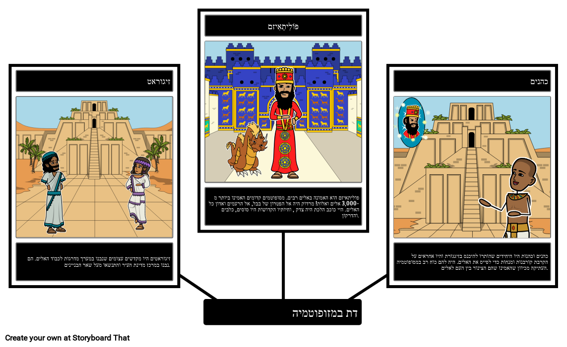 זיגוראטים היו מקדשים עצומים שנבנו במערך מדרגות לכבוד האלים. הם נבנו במרכז מדינת העיר והתנשאו מעל שאר הבניינים.
