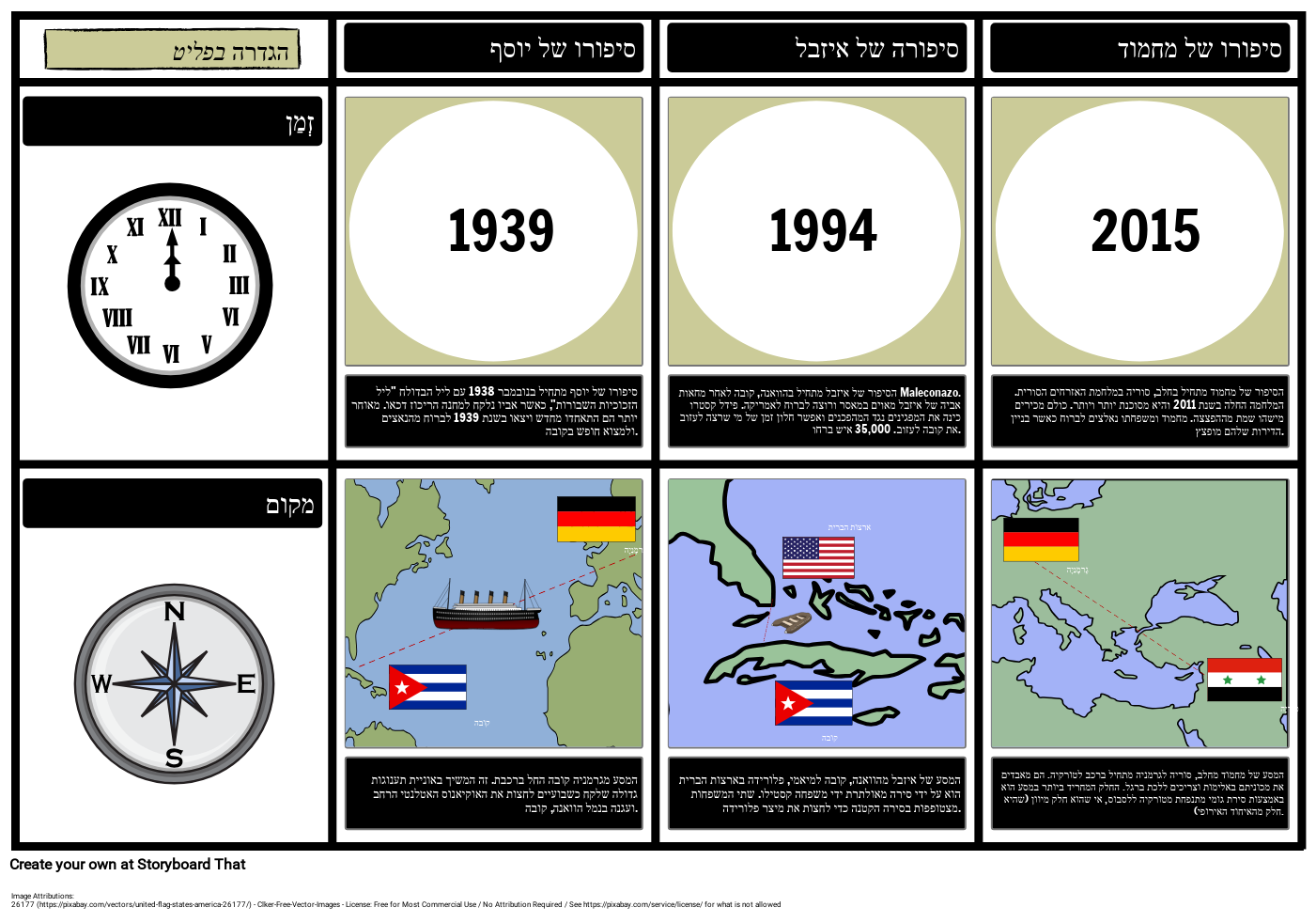 ההגדרה של סיפור היא המיקום והשעה, או היכן ומתי. הגדרות ממלאות לעתים קרובות תפקיד מכריע במיוחד במקרה של בדיה היסטורית או כשיש מספר מקומות וצירי זמן כפי שקורה בספר "פליטים" מאת אלן גרץ. לוח סיפור זה עוזר לתלמידים למפות היכן ומתי כל אחד מהסיפורים בפליטים מתרחש.