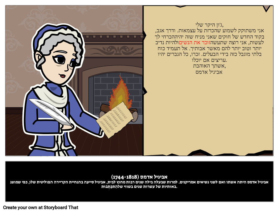 ג'ון היקר שלי, אני משתוקק לשמוע שהכרזת על עצמאות. ודרך אגב, בקוד החדש של חוקים שאני מניח שזה יהיההכרחי לך לעשות, אני רוצה שתעשהזוכר את הנשיםולהיות נדיב יותר וטוב יותר להם מאשר אבותיך. אל תעמיד כוח בלתי מוגבל כזה בידי הבעלים. זכרו, כל הגברים יהיו עריצים אם יוכלו.אשתך האוהבת,אביגיל אדמס