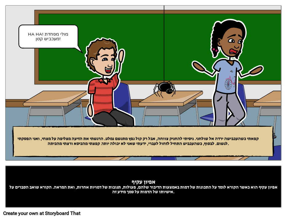 קפאתי כשהעכבישה ירדה אל שולחני. ניסיתי להחניק צווחה, אבל רק קול נפץ מתנשם נמלט. הרגשתי את הזיעה מצליפה על מצחי, ואני הפסקתי לנשום. לבסוף, כשהעכביש התחיל לזחול לעברי, ידעתי שאני לא יכולה יותר. קפצתי מהכיסא ורצתי מהכיתה.