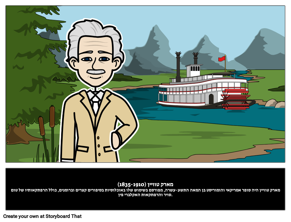 מארק טוויין (1835-1910)מארק טוויין היה סופר אמריקאי והומוריסט בן המאה התשע-עשרה, מפורסם בשימוש שלו באוכלוסיות בסיפורים קצרים וברומנים, כולל הרפתקאותיו של טום סויר והרפתקאות האקלברי פין.