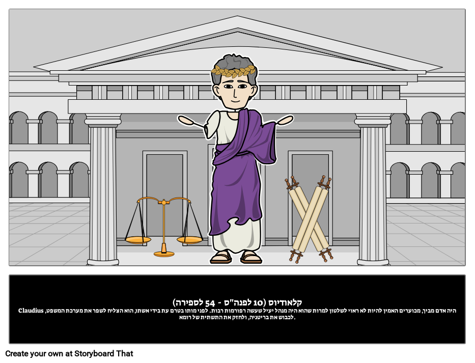 קלאודיוס (10 לפנה"ס - 54 לספירה) Claudius היה אדם מביך, מכוערים האמין להיות לא ראוי לשלטון למרות שהוא היה מנהל יעיל שעשה רפורמות רבות. לפני מותו בטרם עת בידי אשתו, הוא הצליח לשפר את מערכת המשפט, לכבוש את בריטניה, ולחזק את התשתית של רומא.