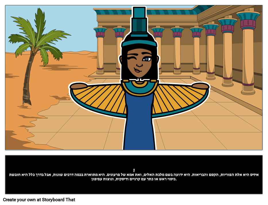 Jאיזיס היא אלת הפוריות, הקסם והבריאות. היא ידועה בשם מלכת האלים, ואת אמא של פרעונים. היא מתוארת בכמה דרכים שונות, אבל בדרך כלל היא חובשת כיסוי ראש או כתר עם קרניים ודיסקית, ונוצות עפיפון.