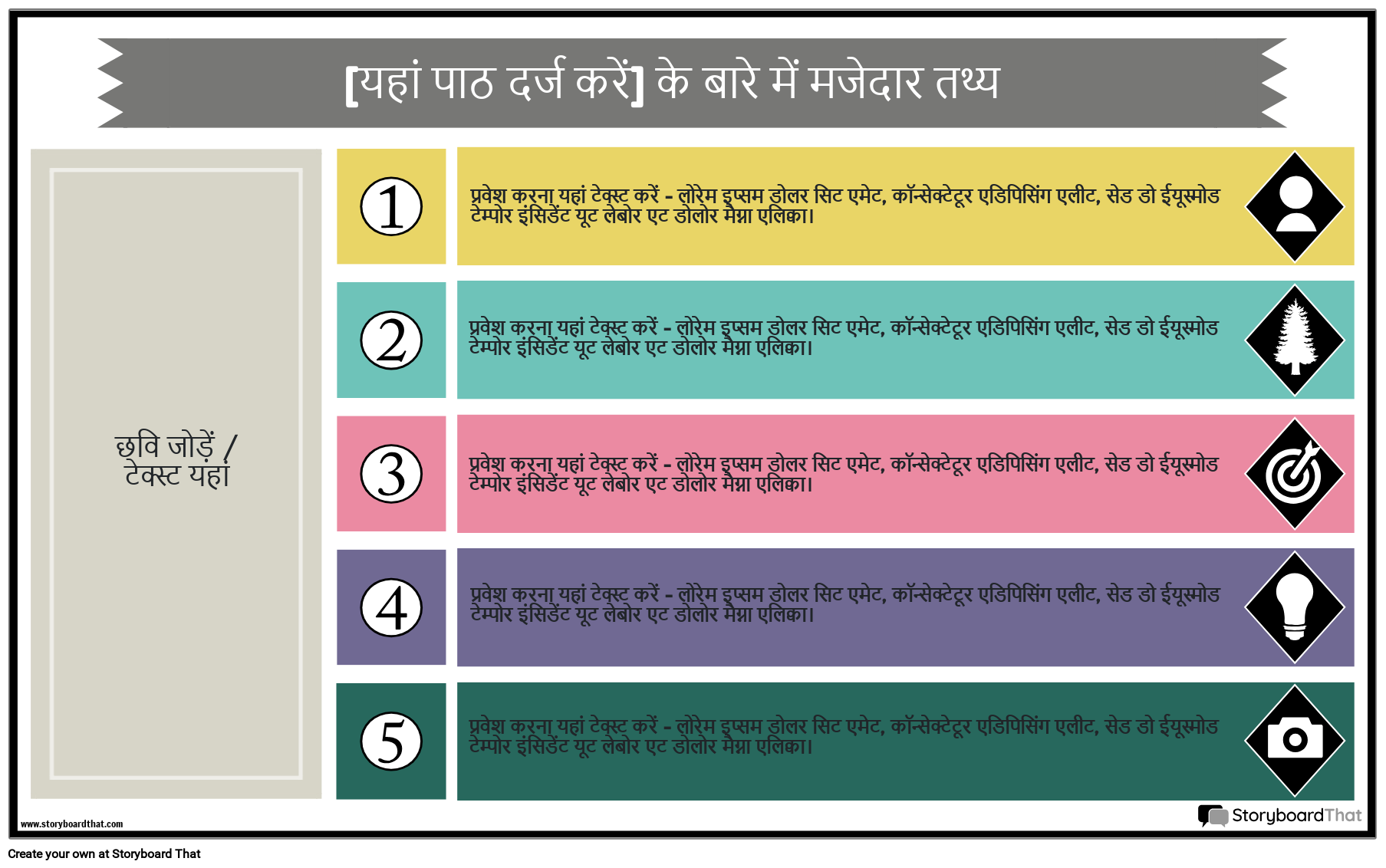 किसी विषय या रुचि के व्यक्ति के बारे में मजेदार तथ्यों के साथ एक रंगीन और सूचनात्मक इन्फोग्राफिक बनाएं! छात्र या शिक्षक पाठ और छवियों को जोड़कर इस इन्फोग्राफिक टेम्पलेट को अनुकूलित कर सकते हैं। बाईं ओर एक बड़ा फ्रेम है जहां विषय का प्रतिनिधित्व करने के लिए एक चरित्र, वस्तु और/या दृश्य जोड़ा जा सकता है। इस पोस्टर को प्रिंट आउट कर कक्षा में प्रमुखता से प्रदर्शित किया जा सकता है या डिजिटल रूप से प्रदर्शित किया जा सकता है।