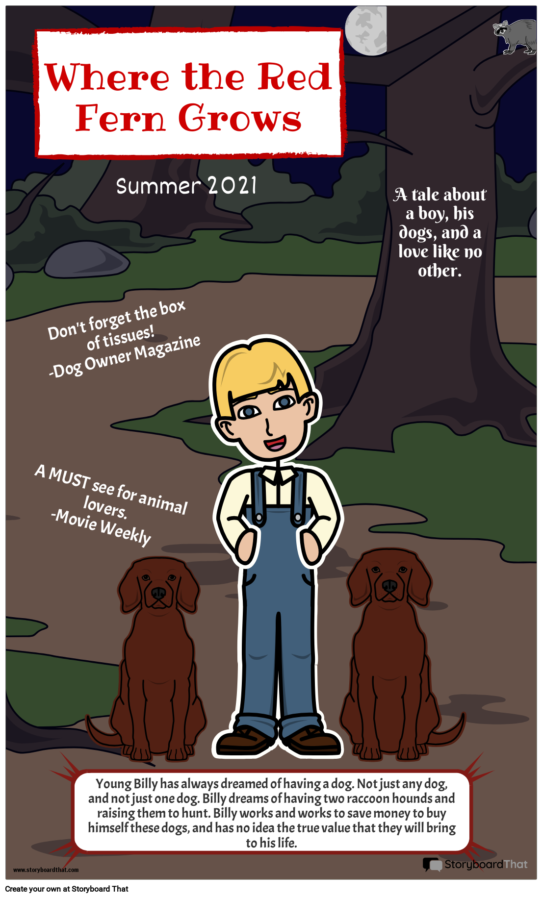 छात्र विल्सन रॉल्स द्वारा व्हेयर द रेड फ़र्न ग्रोज़ के लिए मूवी पोस्टर बना सकते हैं और प्रमुख विषयों, पात्रों, और बहुत कुछ को चित्रित कर सकते हैं!