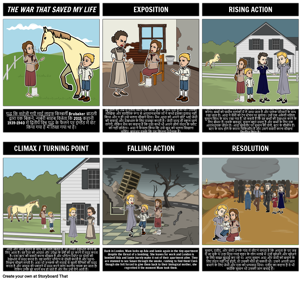 छात्र 6 सेल स्टोरीबोर्ड में कहानी के कथानक को संक्षेप और चित्रण कर सकते हैं, जिसमें प्रदर्शनी और संघर्ष, बढ़ती कार्रवाई, चरमोत्कर्ष / मोड़, गिरती कार्रवाई और संकल्प पर प्रकाश डाला गया है।