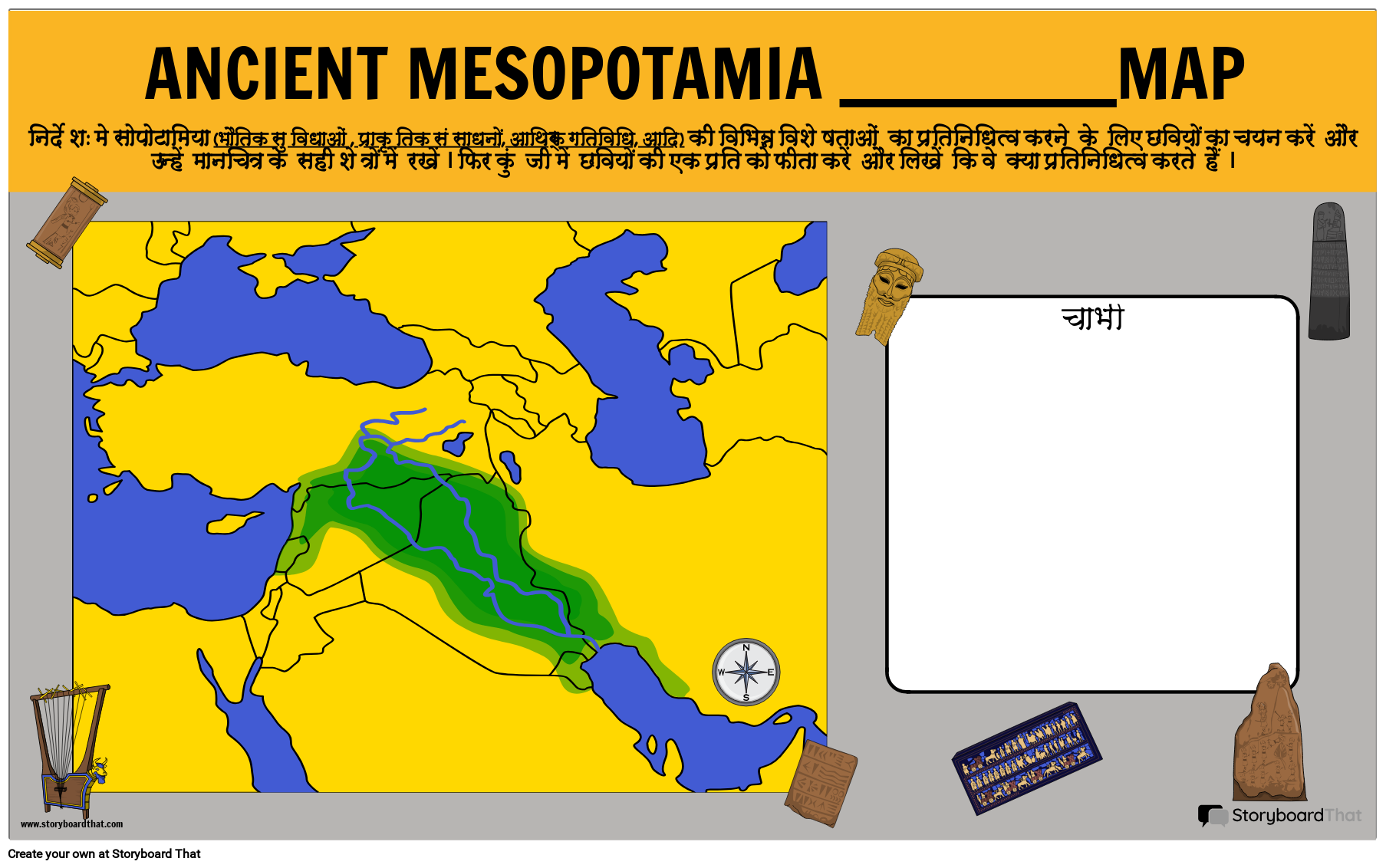 निर्देश: मेसोपोटामिया (भौतिक सुविधाओं, प्राकृतिक संसाधनों, आर्थिक गतिविधि, आदि) की विभिन्न विशेषताओं का प्रतिनिधित्व करने के लिए छवियों का चयन करें और उन्हें मानचित्र के सही क्षेत्रों में रखें। फिर कुंजी में छवियों की एक प्रति को फीता करें और लिखें कि वे क्या प्रतिनिधित्व करते हैं।