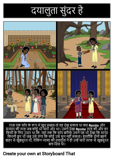 राजा एक साँप के रूप में खुद प्रच्छन्न तो वह देख सकता था क्या Nyasha और मन्यारा की तरह जब कोई भी चारों ओर था। उसने देखा Nyasha तरह की और हर किसी के लिए उदार था कि, यहां तक कि सांप बगीचे! उसने यह भी देखा कि मान्या कितनी क्रूर थी जब उसे लगा कि कोई उसे सुन नहीं सकता। हालाँकि दोनों बहनें बाहर से खूबसूरत थीं, लेकिन न्याशा की दयालुता ने ही उन्हें चारों तरफ से खूबसूरत बना दिया था।