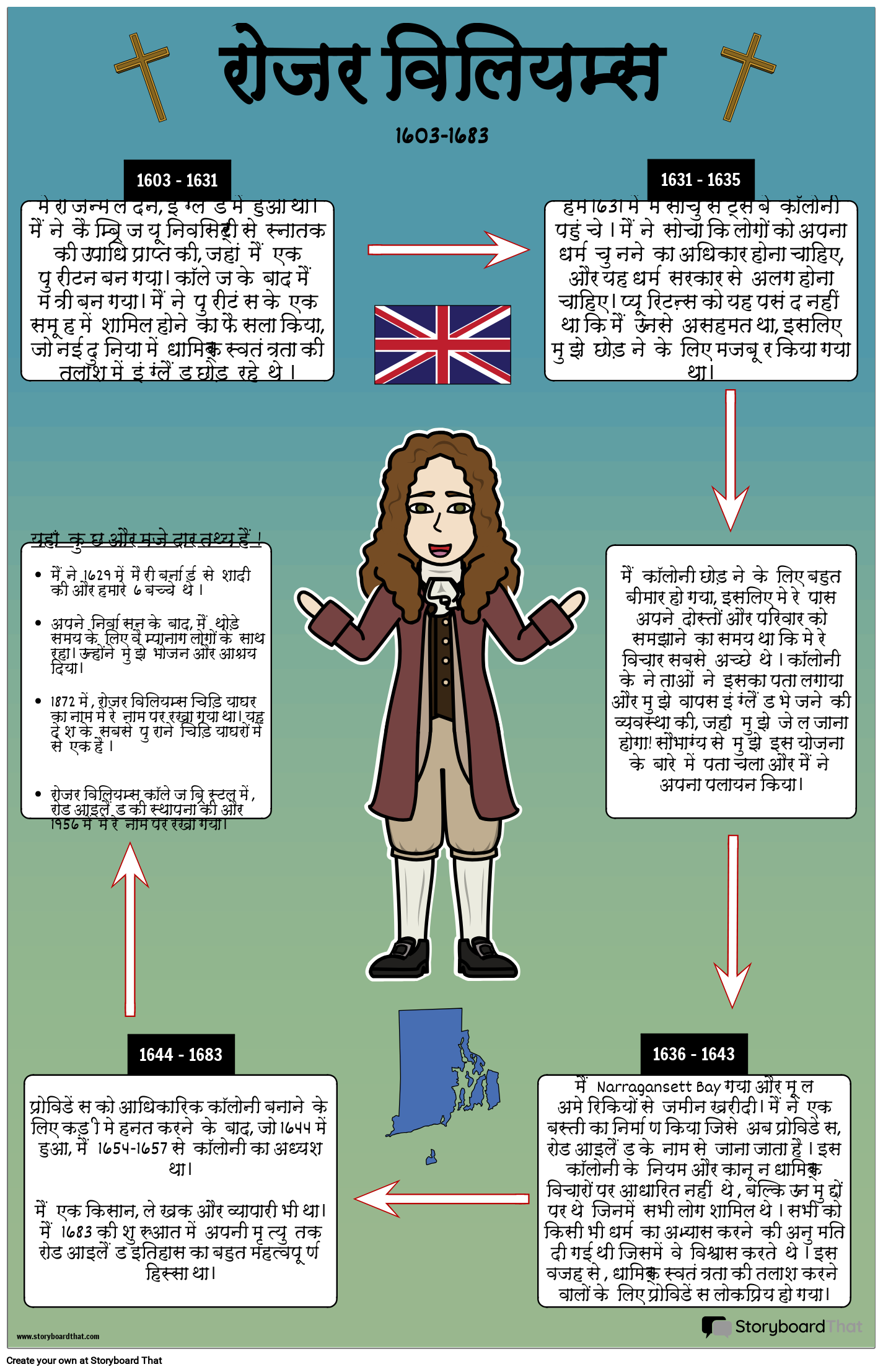 हम 1631 में मैसाचुसेट्स बे कॉलोनी पहुंचे। मैंने सोचा कि लोगों को अपना धर्म चुनने का अधिकार होना चाहिए, और यह धर्म सरकार से अलग होना चाहिए। प्यूरिटन्स को यह पसंद नहीं था कि मैं उनसे असहमत था, इसलिए मुझे छोड़ने के लिए मजबूर किया गया था।
