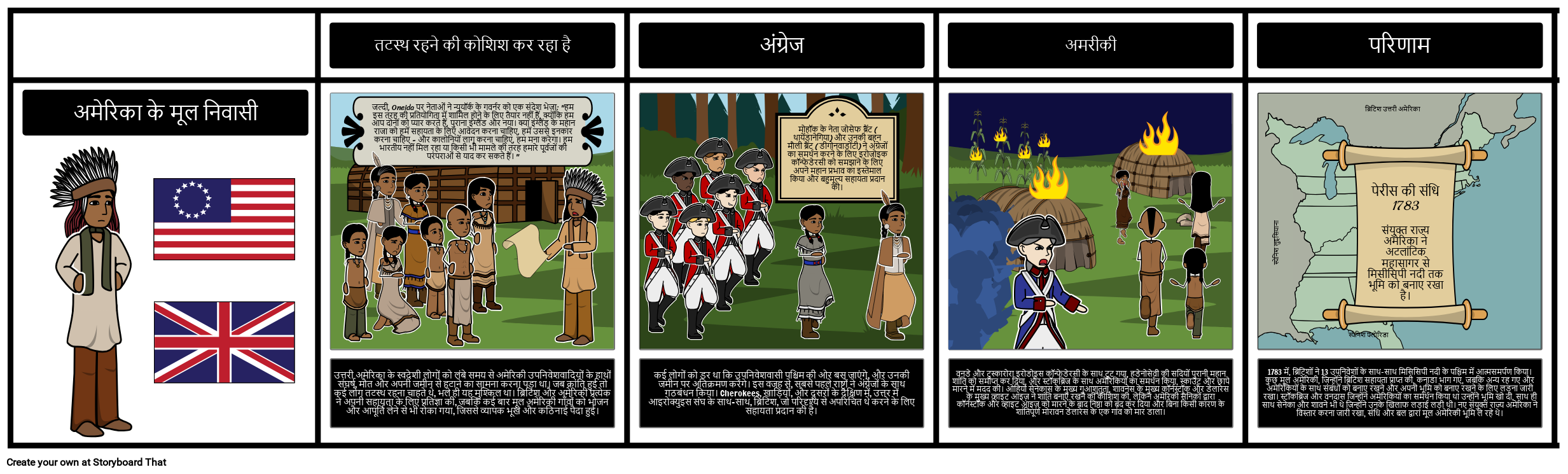उत्तरी अमेरिका के स्वदेशी लोगों को लंबे समय से अमेरिकी उपनिवेशवादियों के हाथों संघर्ष, मौत और अपनी जमीन से हटाने का सामना करना पड़ा था। जब क्रांति हुई तो कई लोग तटस्थ रहना चाहते थे, भले ही यह मुश्किल था। ब्रिटिश और अमेरिकी प्रत्येक ने अपनी सहायता के लिए प्रतिज्ञा की, जबकि कई बार मूल अमेरिकी गाँवों को भोजन और आपूर्ति लेने से भी रोका गया, जिससे व्यापक भूख और कठिनाई पैदा हुई।