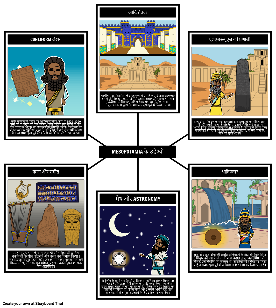 GRAPES: भूगोल, धर्म, उपलब्धियां, राजनीति, अर्थव्यवस्था और सामाजिक जीवन। यह स्टोरीबोर्ड प्राचीन मेसोपोटामिया की कई विविध उपलब्धियों की व्याख्या करता है।