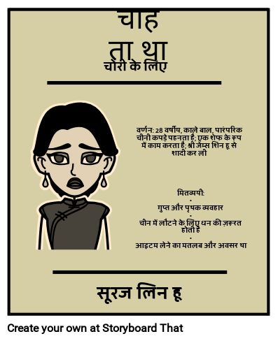वर्णन: 28 वर्षीय, काले बाल, पारंपरिक चीनी कपड़े पहनता है; एक शेफ के रूप में काम करता है; श्री जेम्स शिन हू से शादी कर ली