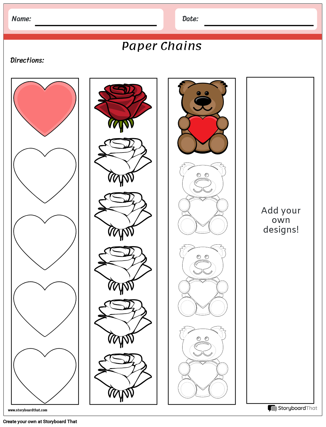 पेपर चेन कक्षा को सजाने का एक मजेदार तरीका है। इनमें दिल, गुलाब और टेडी बियर थीम हैं लेकिन छात्र और शिक्षक निर्माता से कोई भी कला या डिजाइन जोड़ सकते हैं जो उन्हें प्रेरित करता है! कागज़ की जंजीरों को एक सनकी सजावट के लिए मुद्रित, काटा और कक्षा के चारों ओर लटका दिया जा सकता है!