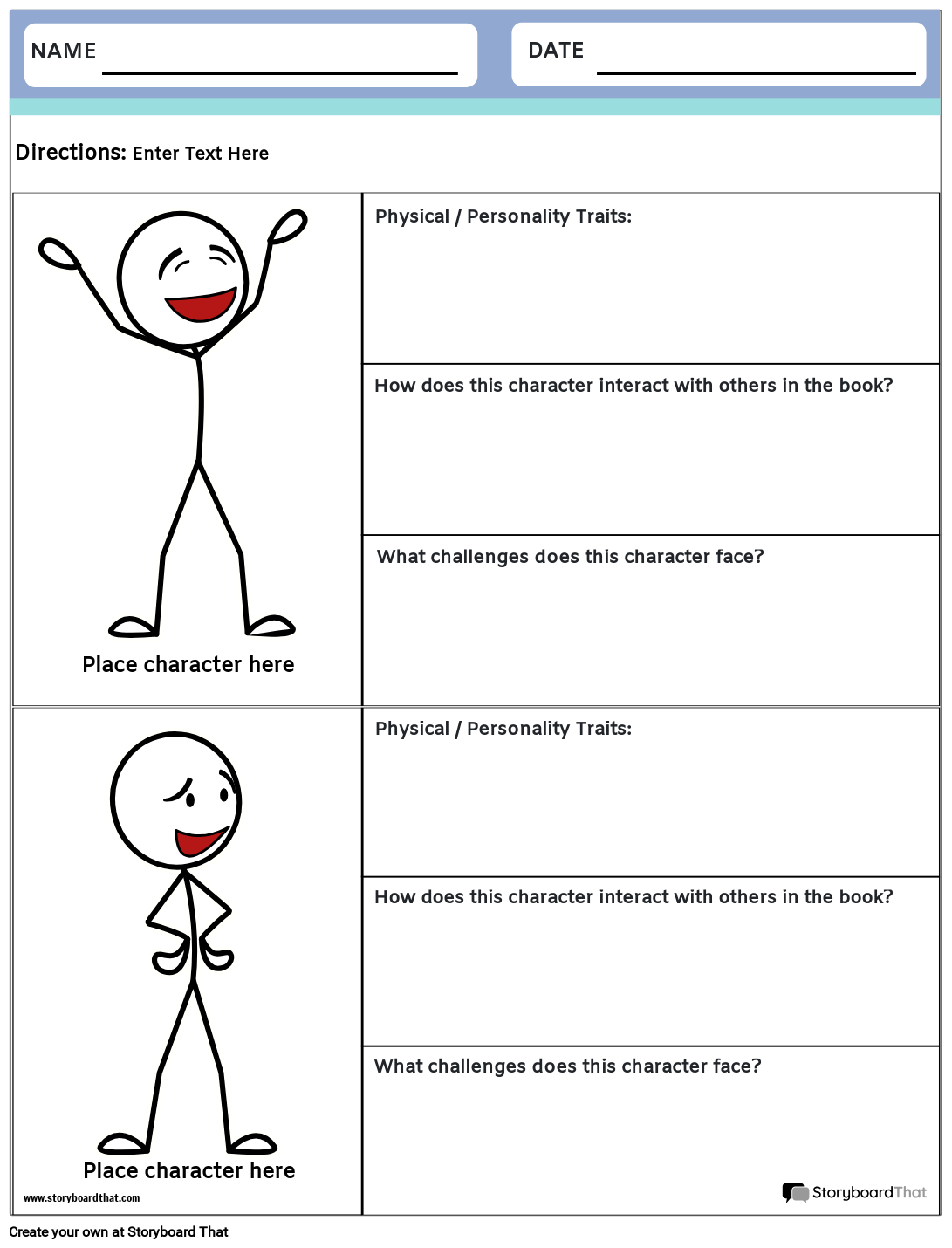 कैरेक्टर मैप वर्कशीट प्रति पेज दो कैरेक्टर वाली वर्कशीट जिसमें छात्रों को कैरेक्टर बनाने या जोड़ने, उनके लक्षणों, इंटरैक्शन और चुनौतियों के बारे में लिखने के लिए स्पेस हो। मुद्रित या डिजिटल रूप से इस्तेमाल किया जा सकता है।