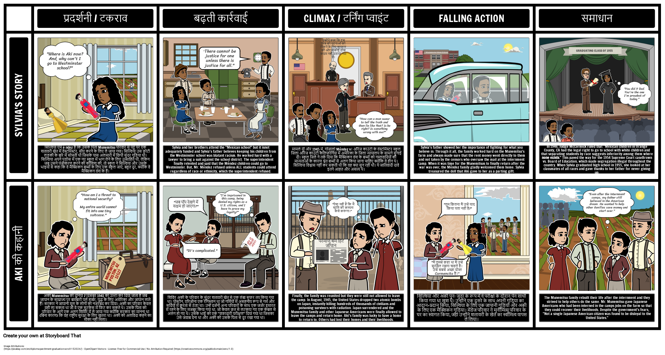 छात्र कहानी के कथानक को एक स्टोरीबोर्ड में सारांशित और चित्रित कर सकते हैं जो प्रदर्शनी और संघर्ष, बढ़ती कार्रवाई, चरमोत्कर्ष / मोड़, गिरने की क्रिया और संकल्प को उजागर करता है। यह स्टोरीबोर्ड सिल्विया और अकी की कहानियों को एक 2x5 ग्रिड में अगल-बगल दिखाता है।
