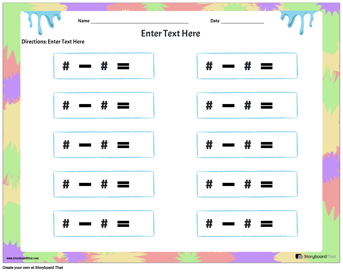 10 प्रश्नों के साथ घटाव कार्यपत्रक। थीम्ड पेंट।