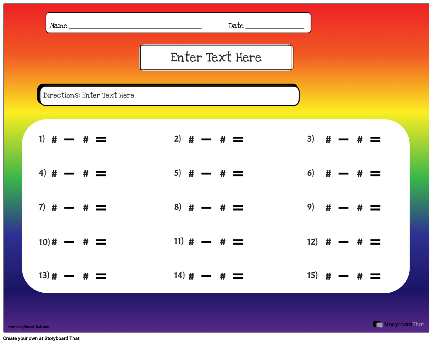 इंद्रधनुष थीम्ड घटाव कार्यपत्रक। 15 समस्याओं के साथ लैंडस्केप।