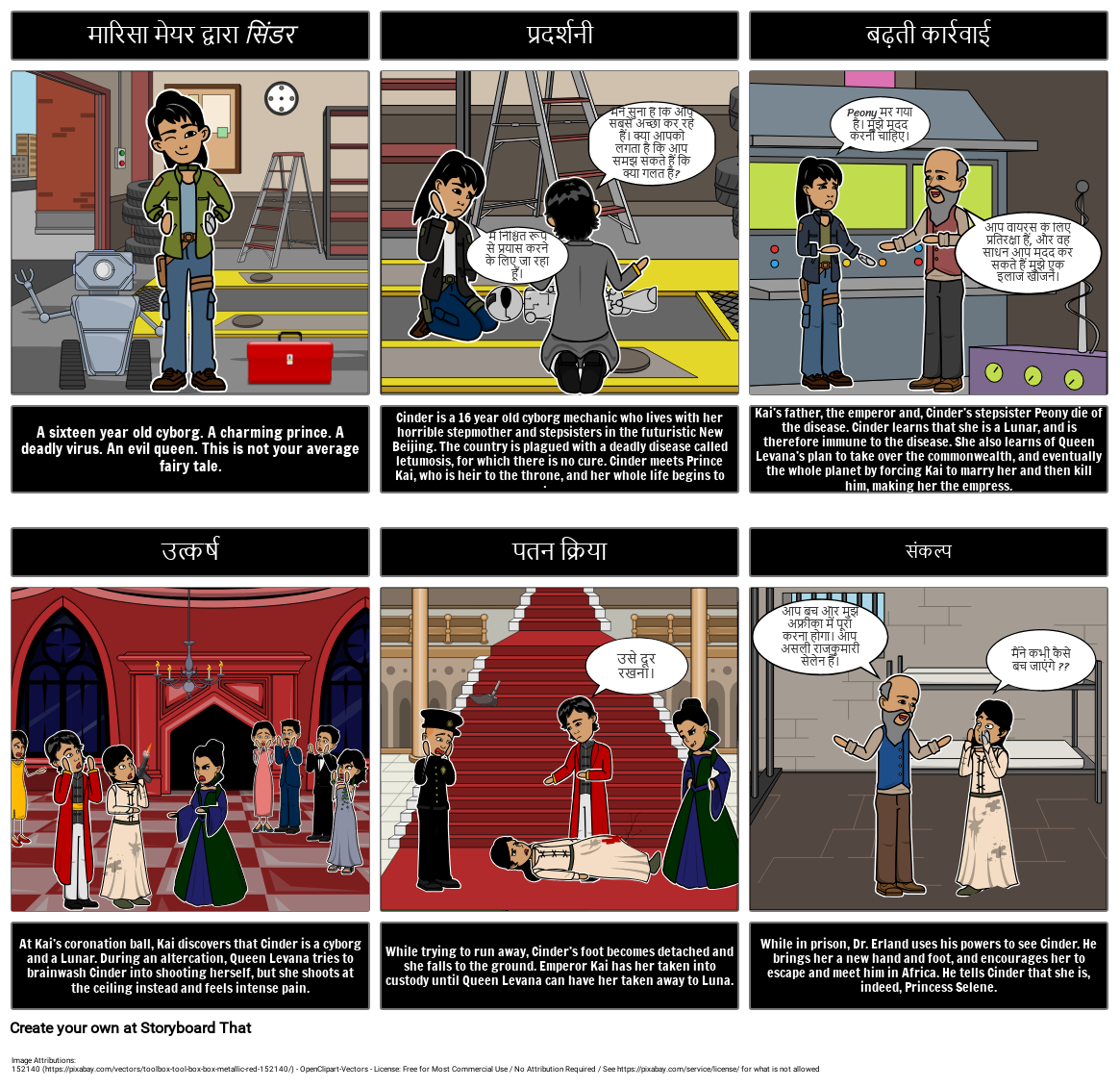 छात्र मारिसा मेयर द्वारा सिंडर के लिए एक दृश्य प्लॉट आरेख बना सकते हैं, जो कहानी के महत्वपूर्ण क्षणों को उजागर करता है।