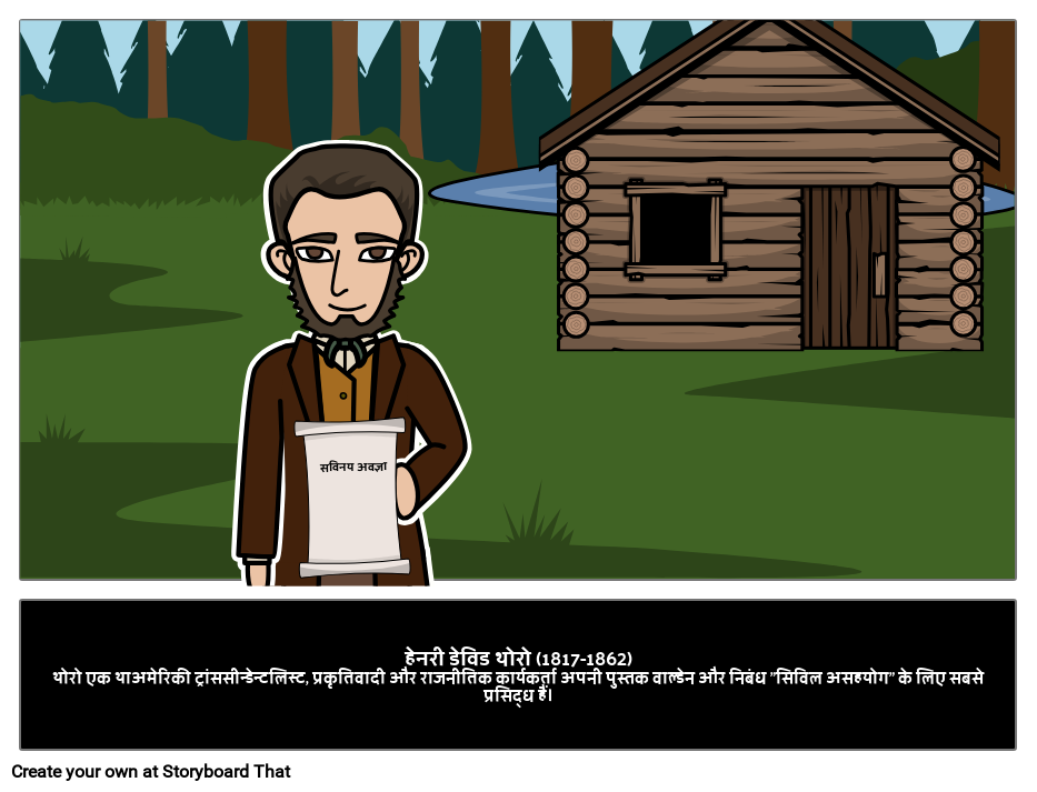 हेनरी डेविड थोरो (1817-1862)थोरो एक थाअमेरिकी ट्रांससीन्डेन्टलिस्ट, प्रकृतिवादी और राजनीतिक कार्यकर्ता अपनी पुस्तक वाल्डेन और निबंध "सिविल असहयोग" के लिए सबसे प्रसिद्ध हैं।