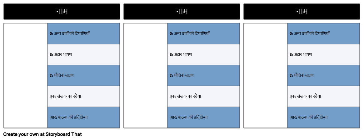 O: अन्य वर्णों की टिप्पणियाँ S: अक्षर भाषण C: भौतिक लक्षण एक: लेखक का रवैया आर: पाठक की प्रतिक्रिया