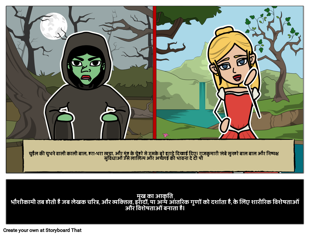 चुड़ैल की चुभने वाली काली बाल, हरा-भरा त्वचा, और मुंह के चेहरे से उसके बुरे इरादे दिखाई दिए। राजकुमारी 'लंबे सुनहरे बाल बाल और निष्पक्ष सुविधाओं उसे लालित्य और अच्छाई की भावना दे दी थी