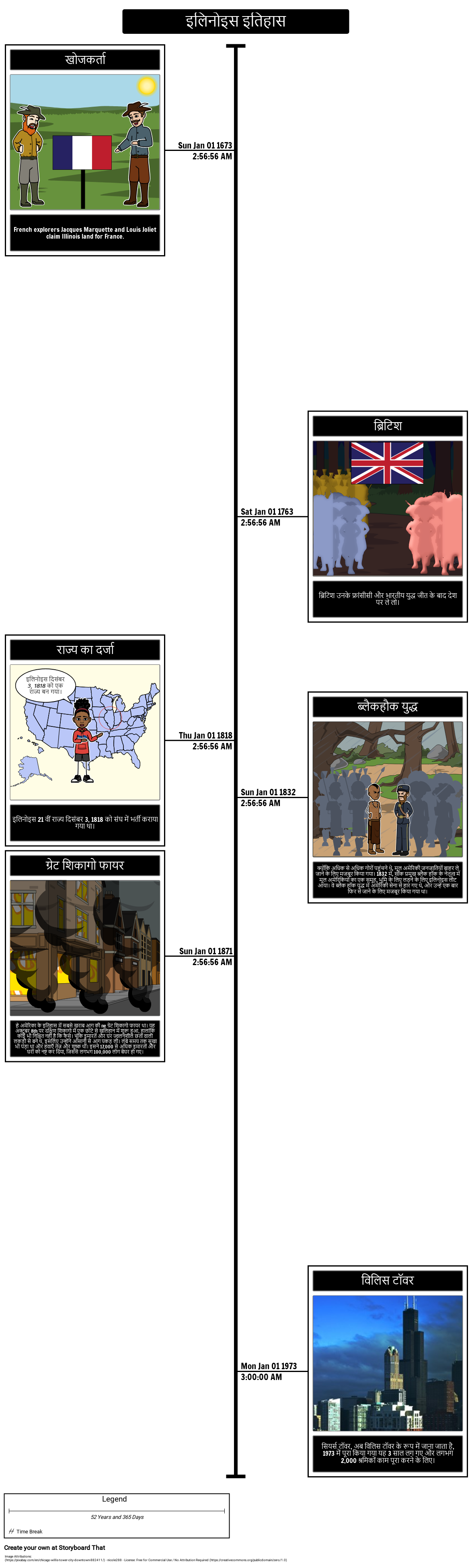 छात्र एक समयरेखा में इलिनोइस के इतिहास का वर्णन कर सकते हैं और पूर्व-राज्य से आधुनिक दिन तक की महत्वपूर्ण घटनाओं को उजागर कर सकते हैं।