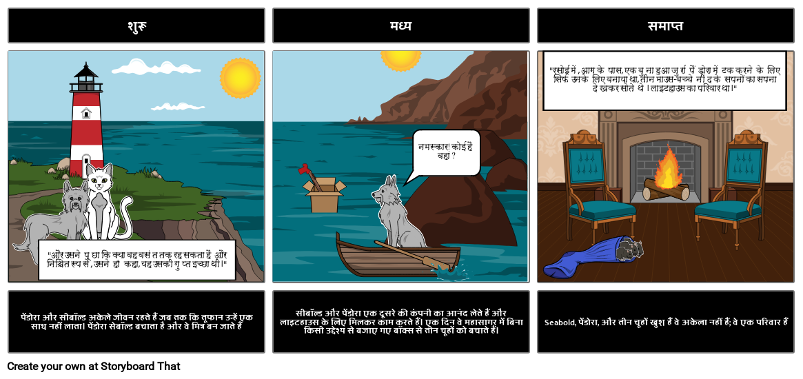 "रसोई में, आग के पास, एक बुना हुआ जुर्रा पैंडोरा में टक करने के लिए सिर्फ उनके लिए बनाया था, तीन माउस-बच्चे नींद के सपनों का सपना देखकर सोते थे। लाइटहाउस का परिवार था।"