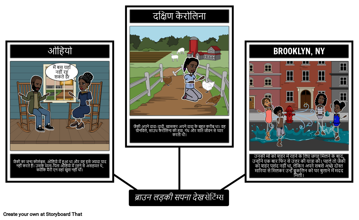 ब्राउन गर्ल ड्रीमिंग में विभिन्न सेटिंग्स और लेखक पर उनके प्रभाव को दर्शाते हुए एक स्टोरीबोर्ड बनाएं।