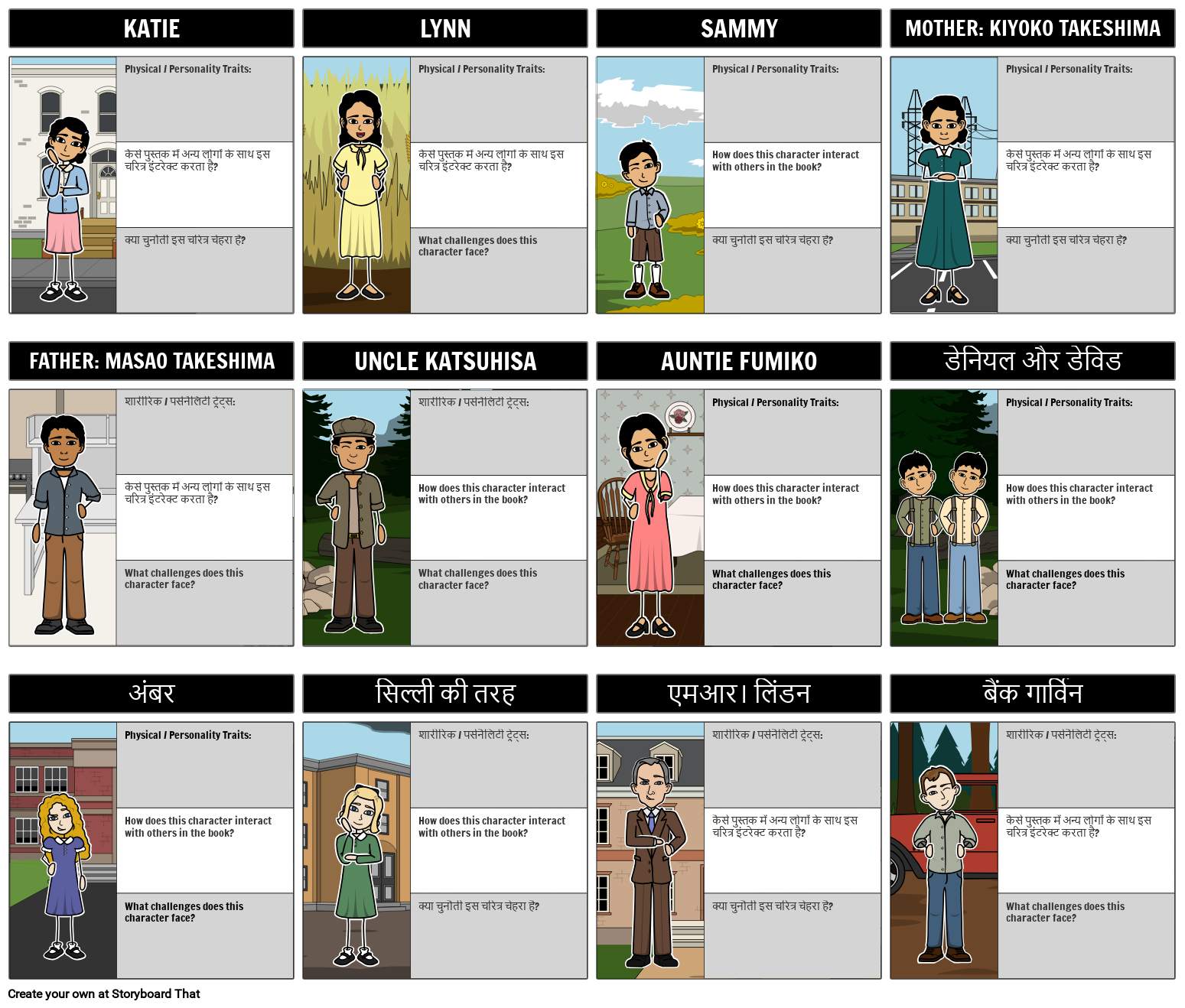 छात्र एक पुस्तक के पात्रों की साजिश कर सकते हैं और प्रत्येक चरित्र के बारे में लिख सकते हैं शारीरिक / व्यक्तित्व लक्षण, दूसरों के साथ उनकी बातचीत और उनके सामने आने वाली चुनौतियाँ।