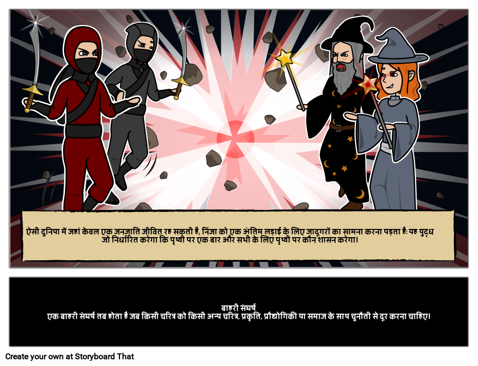 बाहरी संघर्षएक बाहरी संघर्ष तब होता है जब किसी चरित्र को किसी अन्य चरित्र, प्रकृति, प्रौद्योगिकी या समाज के साथ चुनौती से दूर करना चाहिए।