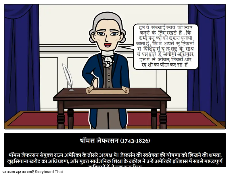 थॉमस जेफरसन (1743-1826)थॉमस जेफरसन संयुक्त राज्य अमेरिका के तीसरे अध्यक्ष थे। जेफ़र्सन की स्वतंत्रता की घोषणा को लिखने की क्षमता, लुइसियाना खरीद का अधिग्रहण, और मुक्त सार्वजनिक शिक्षा के वकील ने उन्हें अमेरिकी इतिहास में सबसे महत्वपूर्ण व्यक्तियों में से एक बना दिया