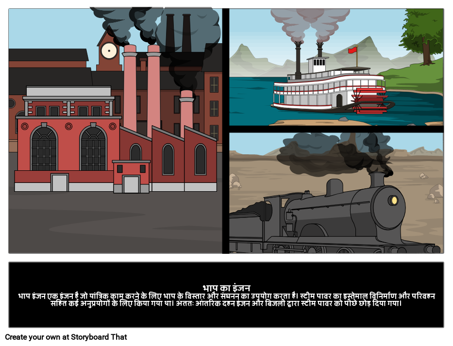 भाप का इंजनभाप इंजन एक इंजन है जो यांत्रिक काम करने के लिए भाप के विस्तार और संघनन का उपयोग करता है। स्टीम पावर का इस्तेमाल विनिर्माण और परिवहन सहित कई अनुप्रयोगों के लिए किया गया था। अंततः आंतरिक दहन इंजन और बिजली द्वारा स्टीम पावर को पीछे छोड़ दिया गया।