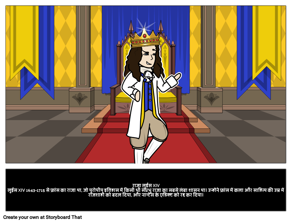 राजा लुईस XIVलुईस XIV 1643-1715 से फ्रांस का राजा था, जो यूरोपीय इतिहास में किसी भी संप्रभु राजा का सबसे लंबा शासन था। उन्होंने फ्रांस में कला और साहित्य की उम्र में राजशाही को बदल दिया, और नान्टेस के एडिक्ट को रद्द कर दिया।